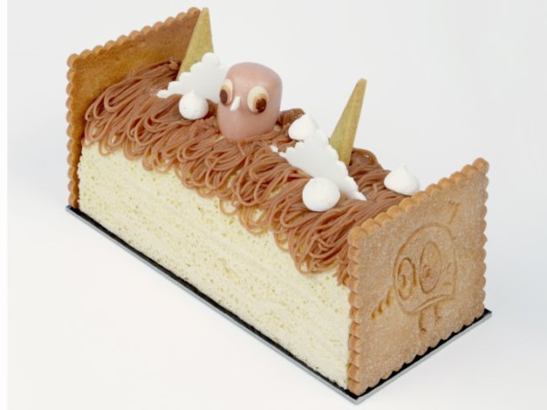 - Démoulez la buche et coller avec la mousse gardée, un sablé rectangulaire à chaque bout de la buche (vous pouvez couper les extrémités pour être droit)